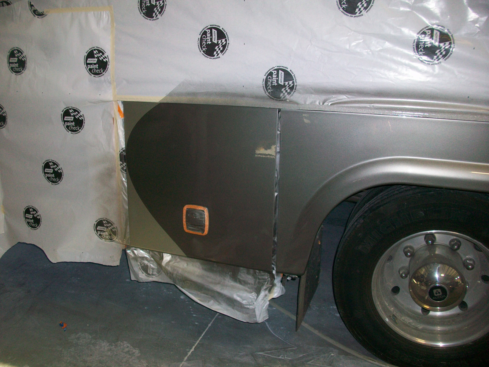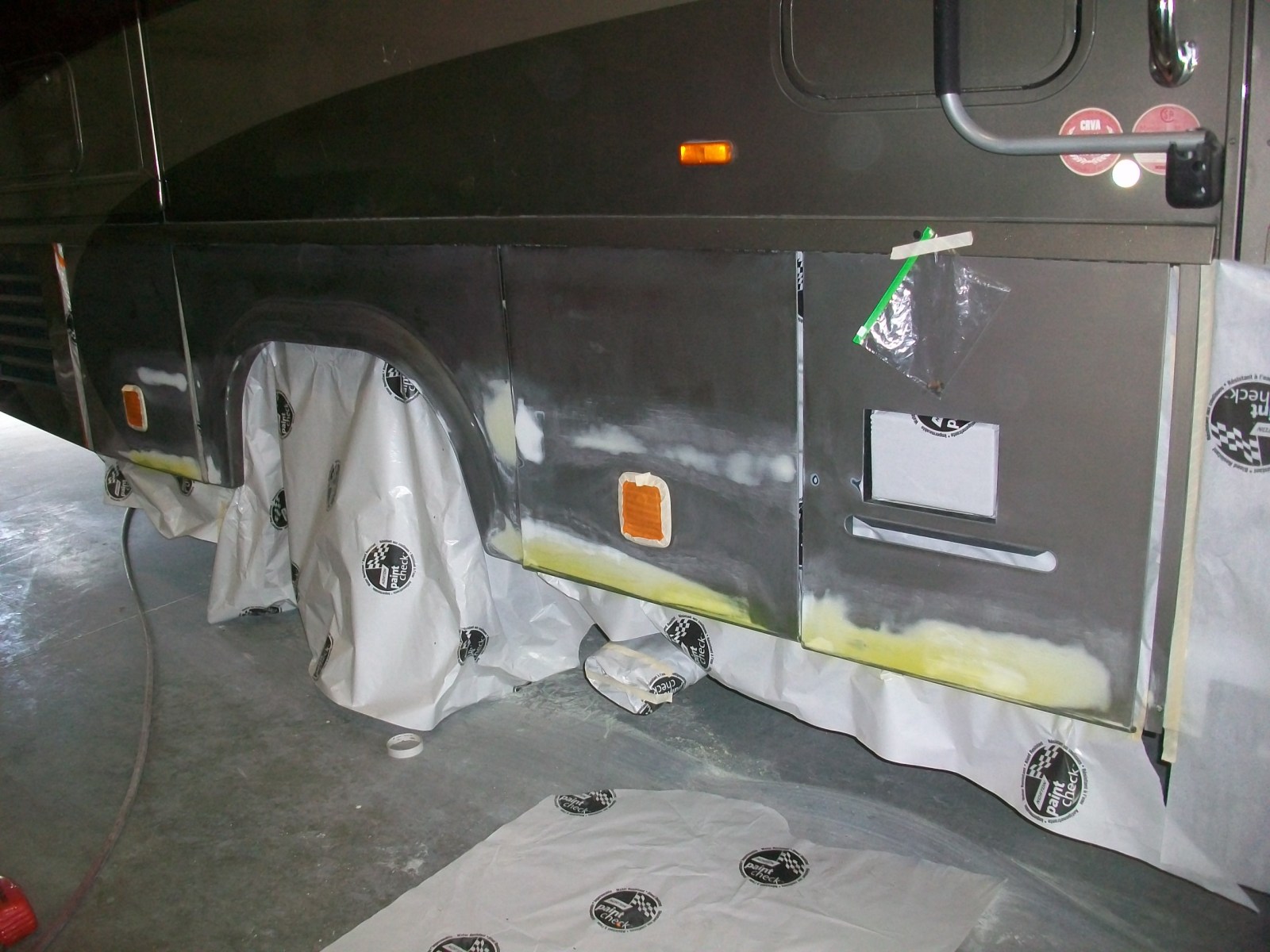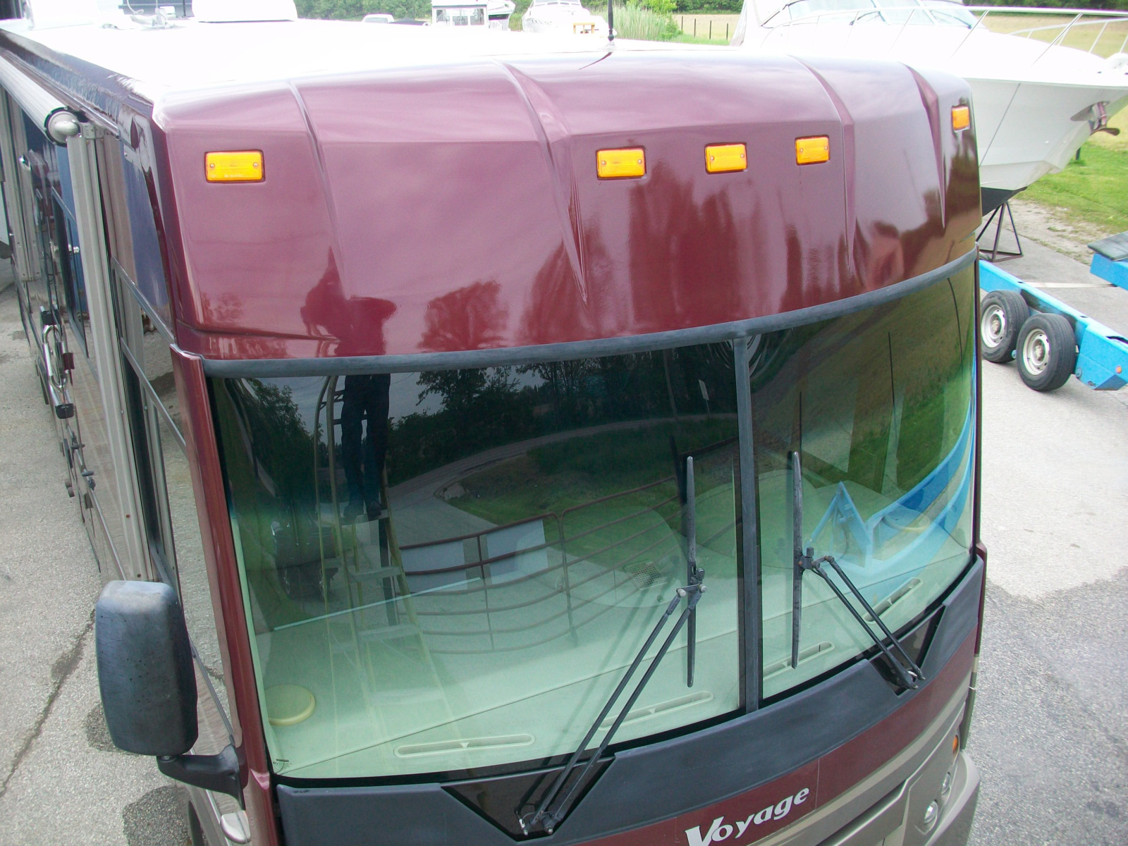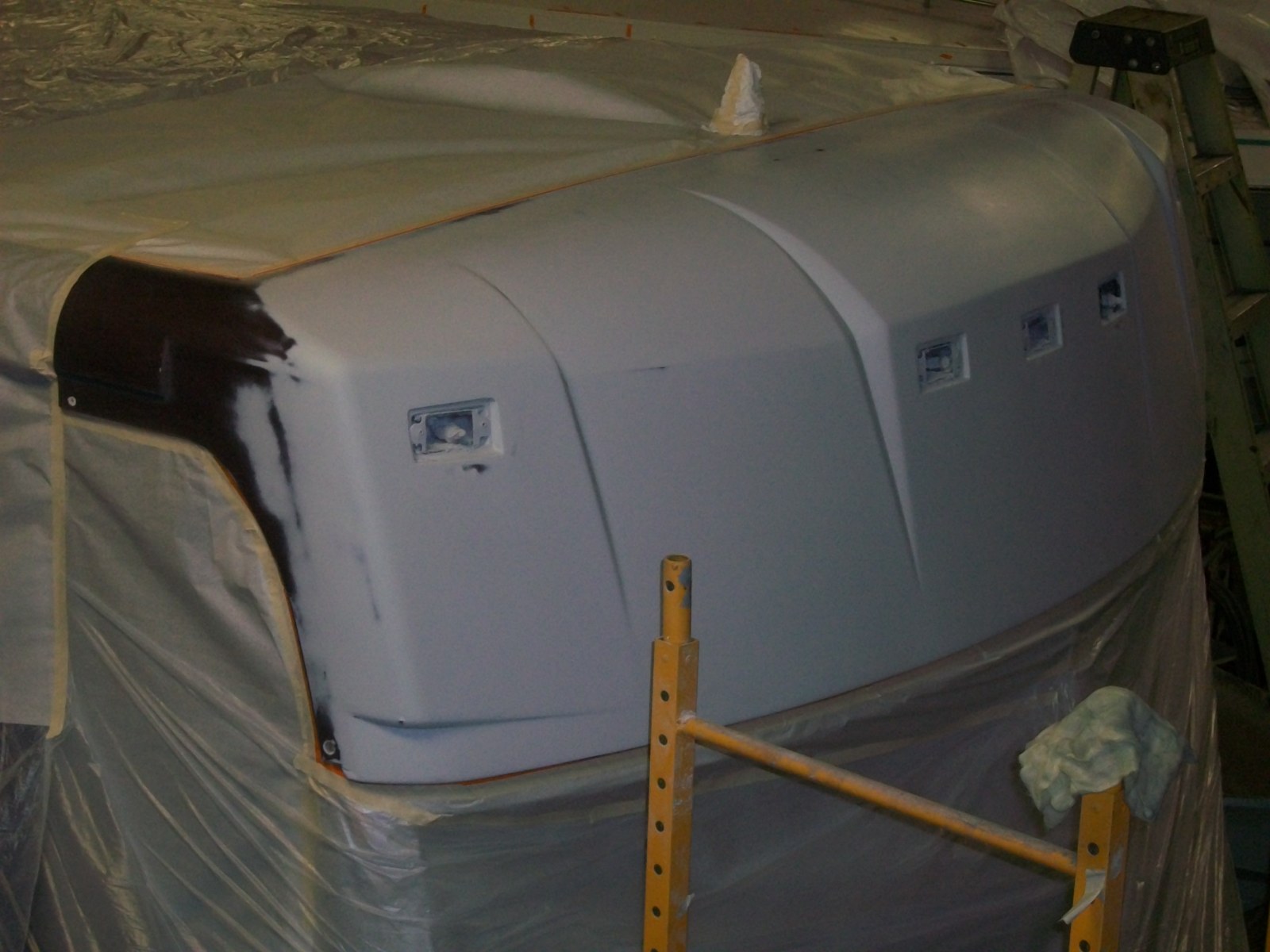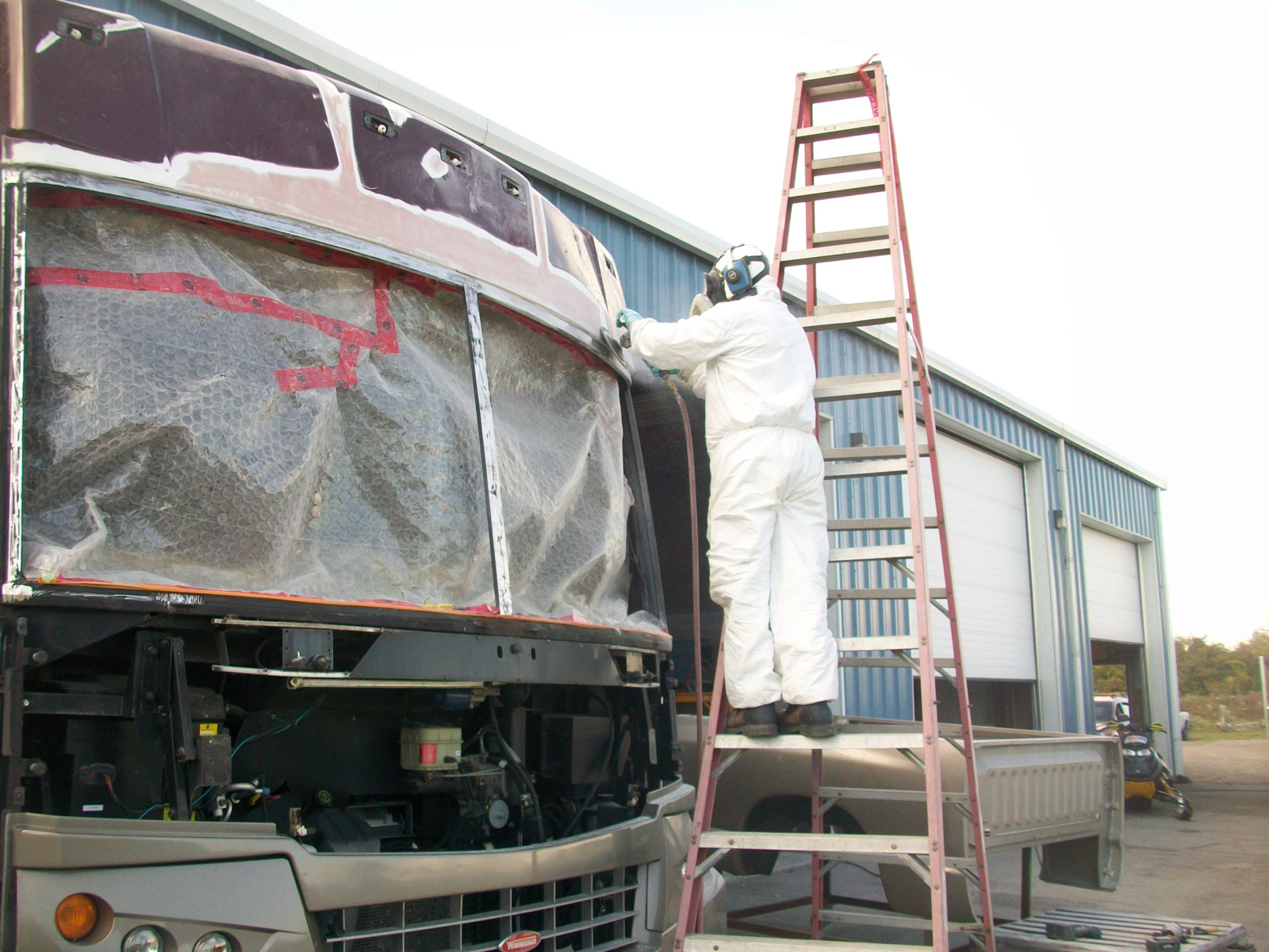 After many miles, this Winnebego’s front cap was covered in stress cracks. Much of the painted areas of the entire top had the clear coat peeling. Under the windscreen, were signs of rust due to water leaks. The rear of the vehicle had damage from a minor collision that needed repair also